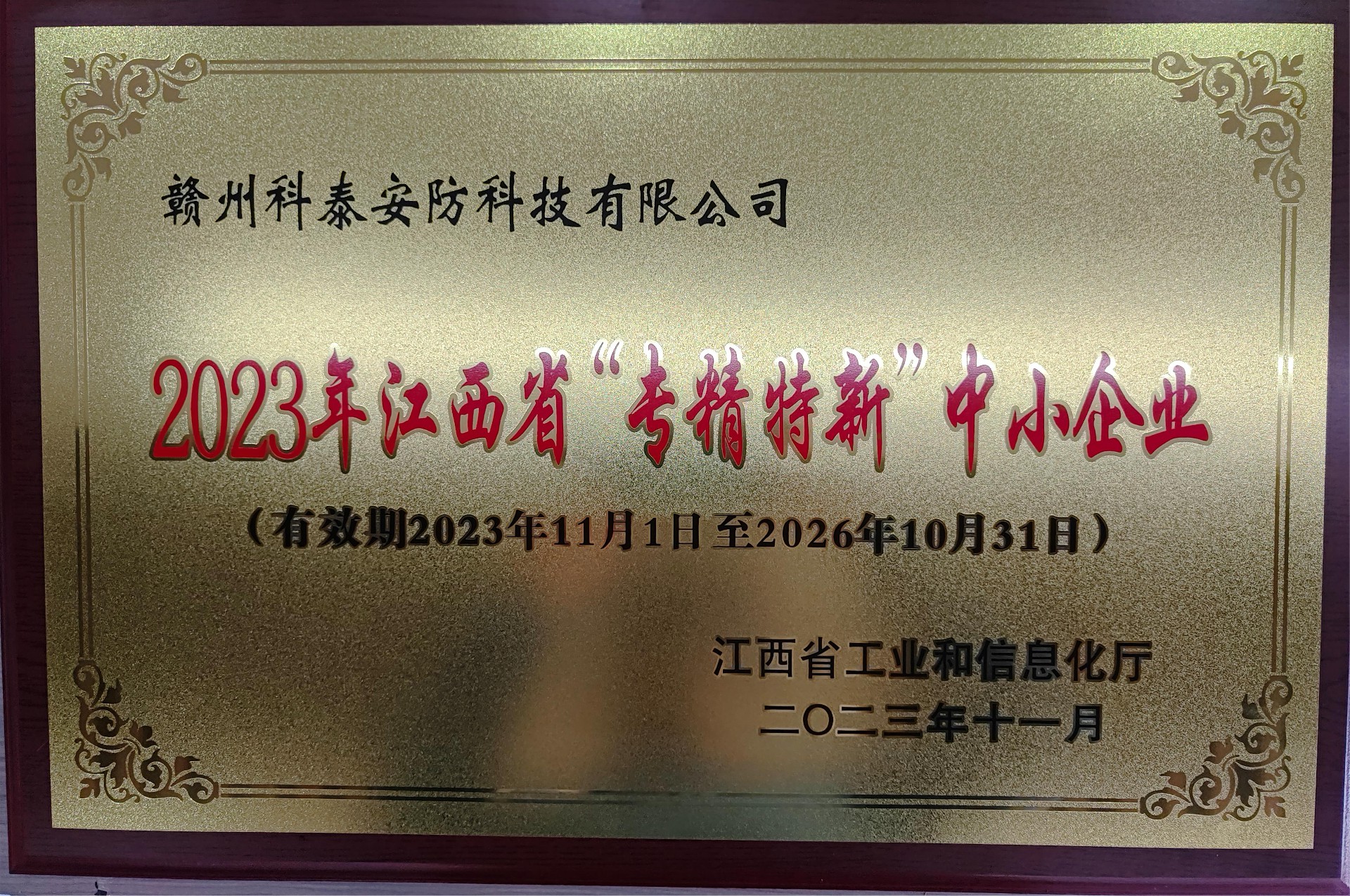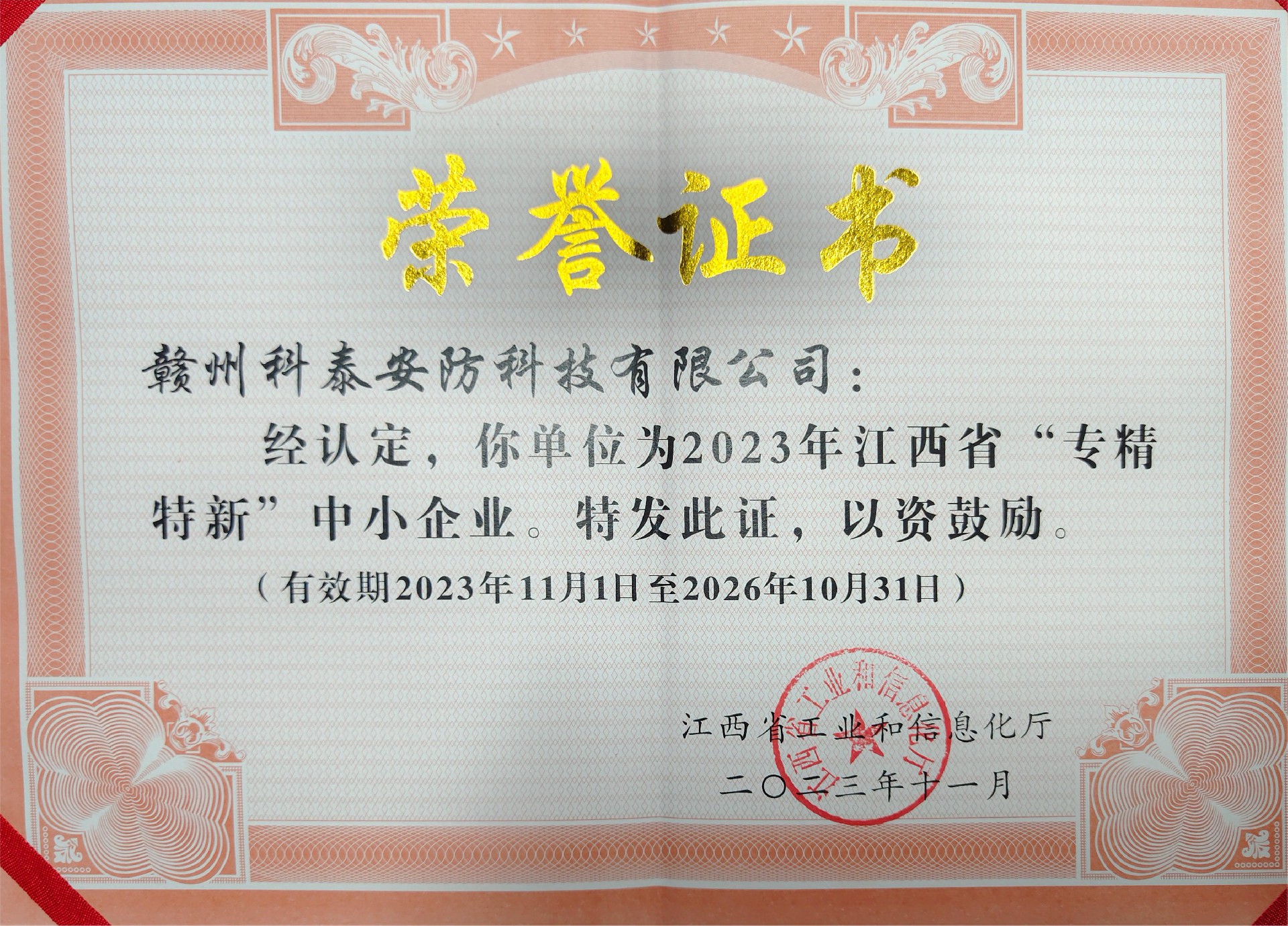 2023年11月1日,贛州科泰安防科技有限公司喜獲“專精特新”中小企業(yè)榮譽證書。